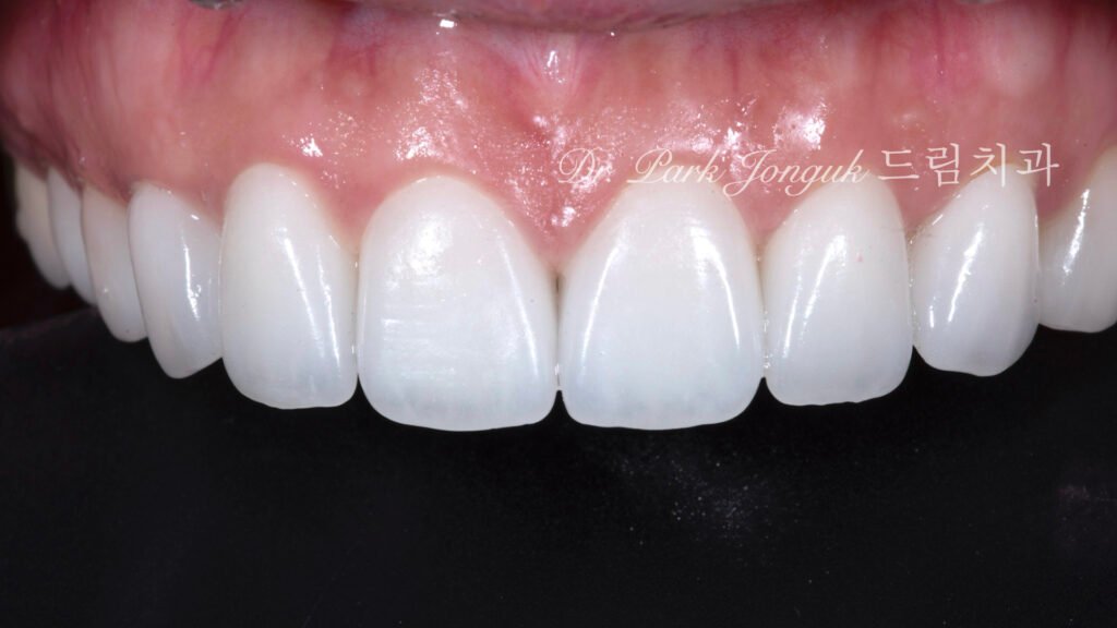 치은이 완전히 회복되지는 않았으나, 치료 전보다 현저히 개선되었습니다. 새로운 라미네이트는 치은 건강을 저해하지 않도록 완벽하게 설계되었습니다.