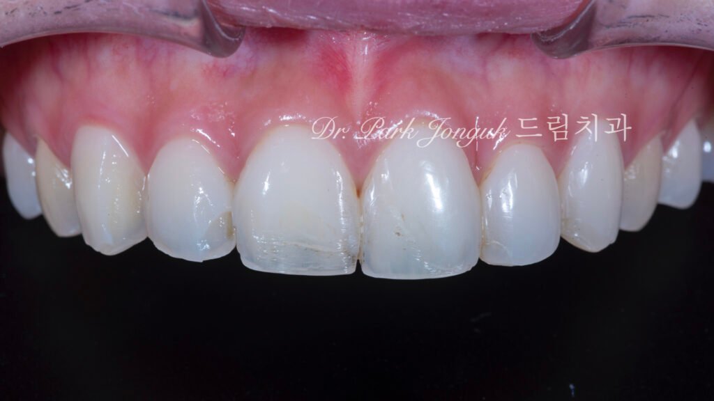 내원 환자는 타 의료기관에서 당일 완성 방식으로 전악 라미네이트 치료를 받은 지 6개월 경과한 상태였습니다.