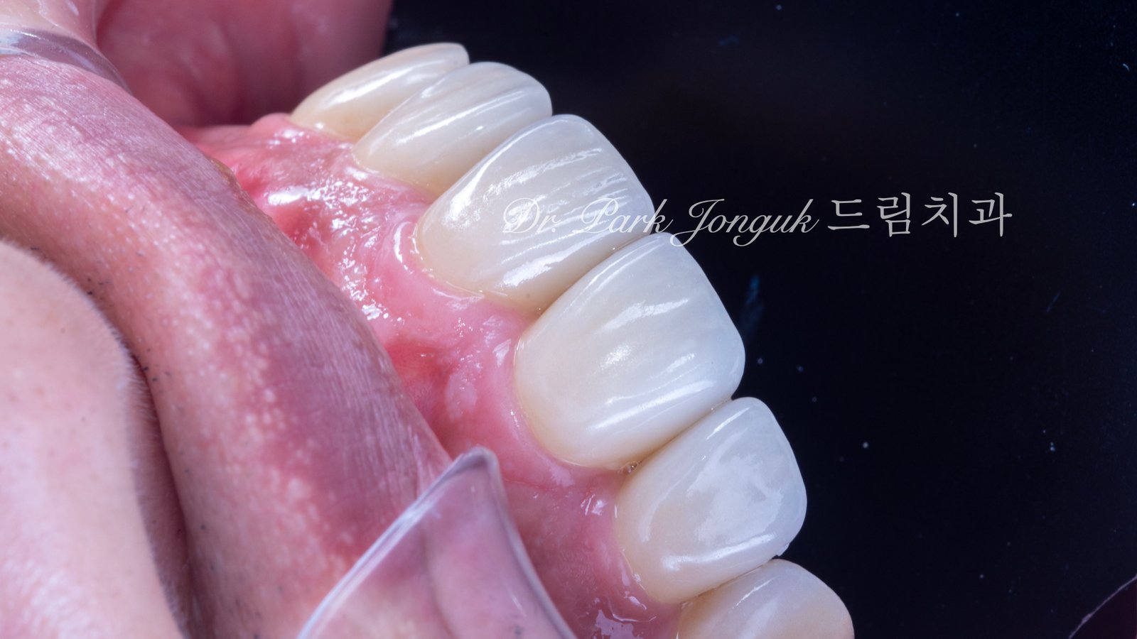이 케이스는 치아가 이미 큰 편이라 무삭제(no-prep)는 불가능했지만, 치아 사이만 최소 삭제하여 크기는 유지하면서도 라미네이트 공간을 확보했습니다.