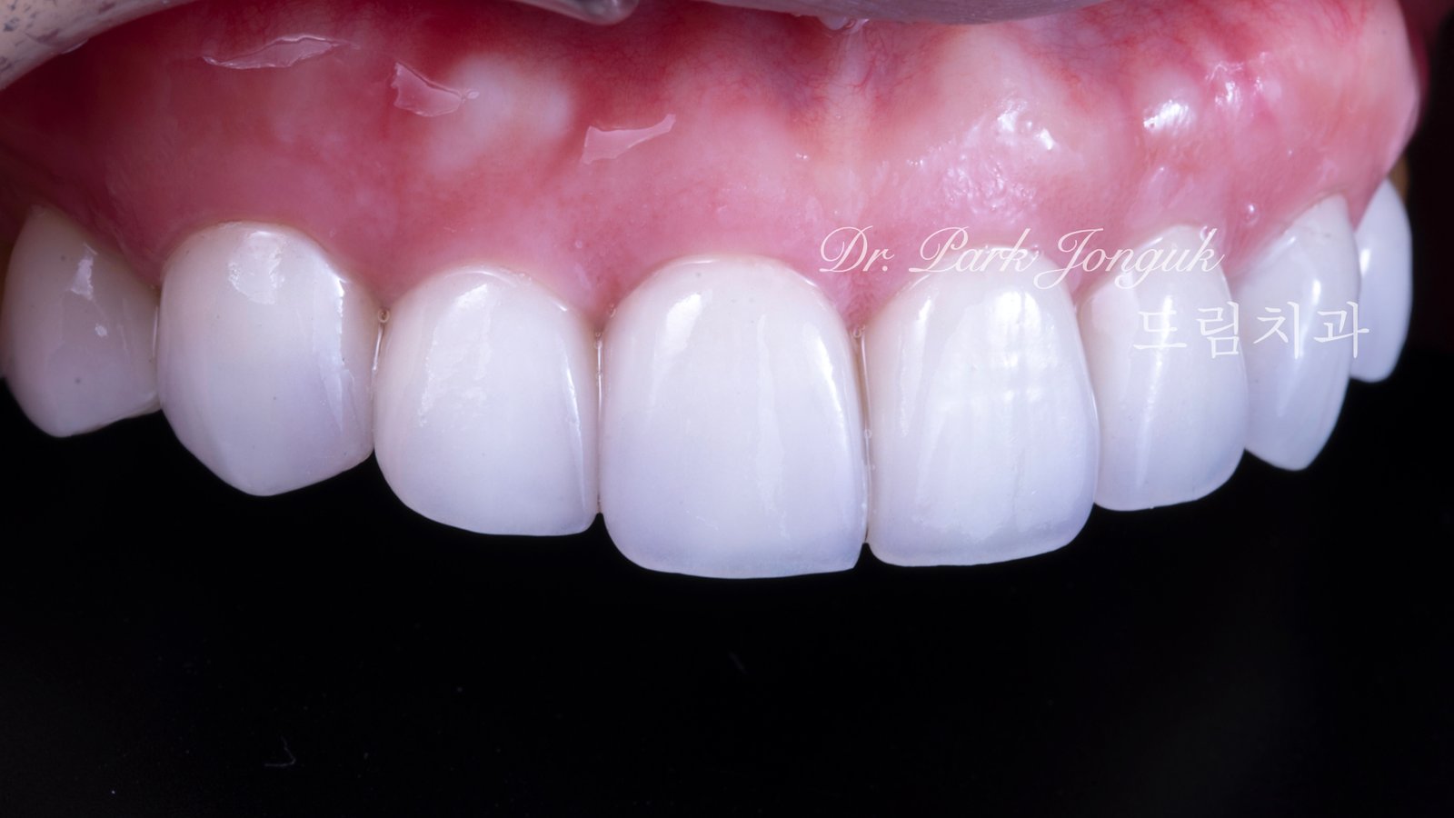 최종적으로 완전히 하얗지는 않지만, 치료 전과 비교하면 엄청난 개선이었습니다. 가장 중요한 것은 환자분이 이제 편하게 웃으실 수 있게 되었다는 점입니다.